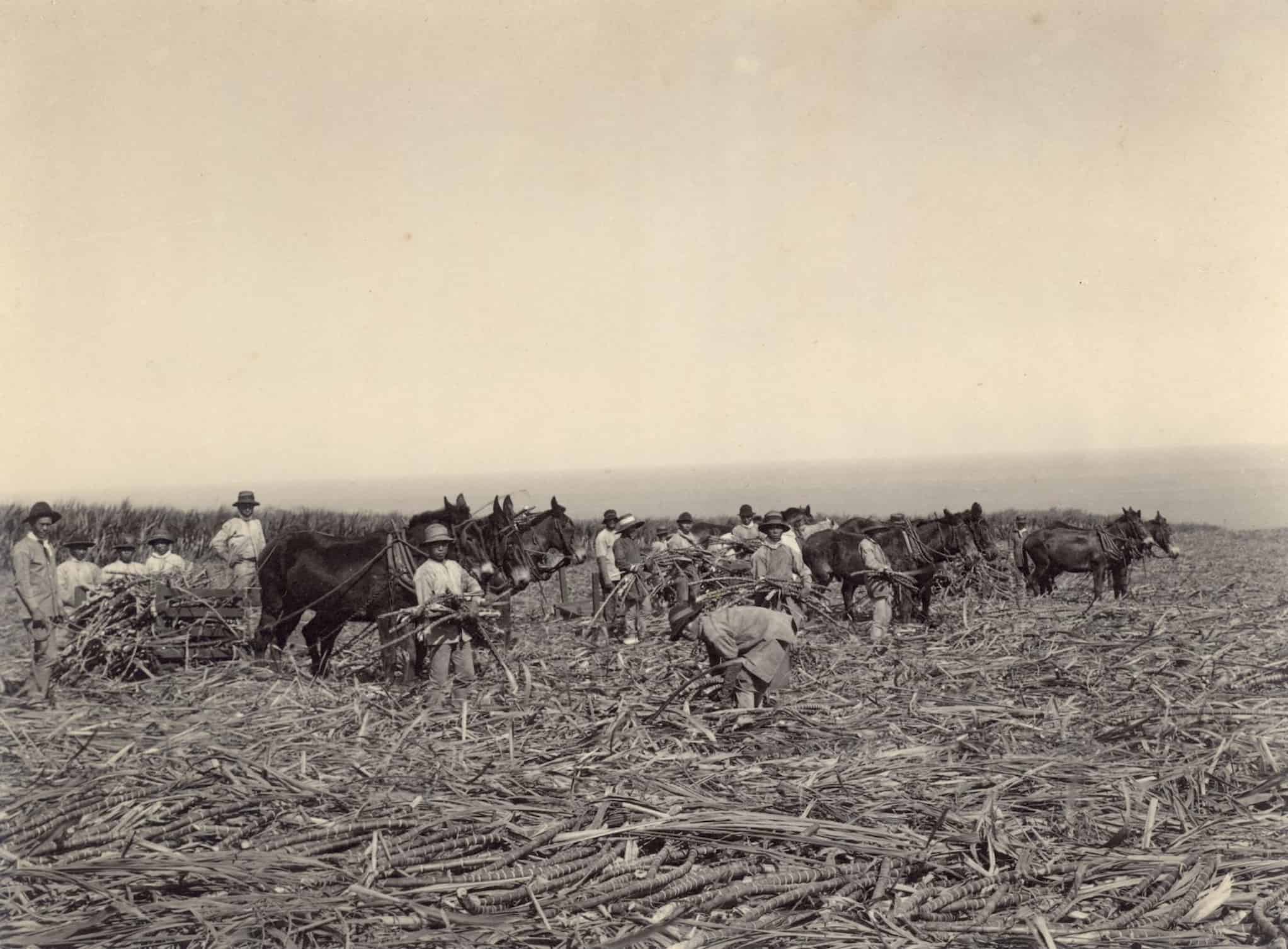 Image 40.01.01 — Laborers in Hawaiʻi used mules to carry sugar cane, circa 1900.