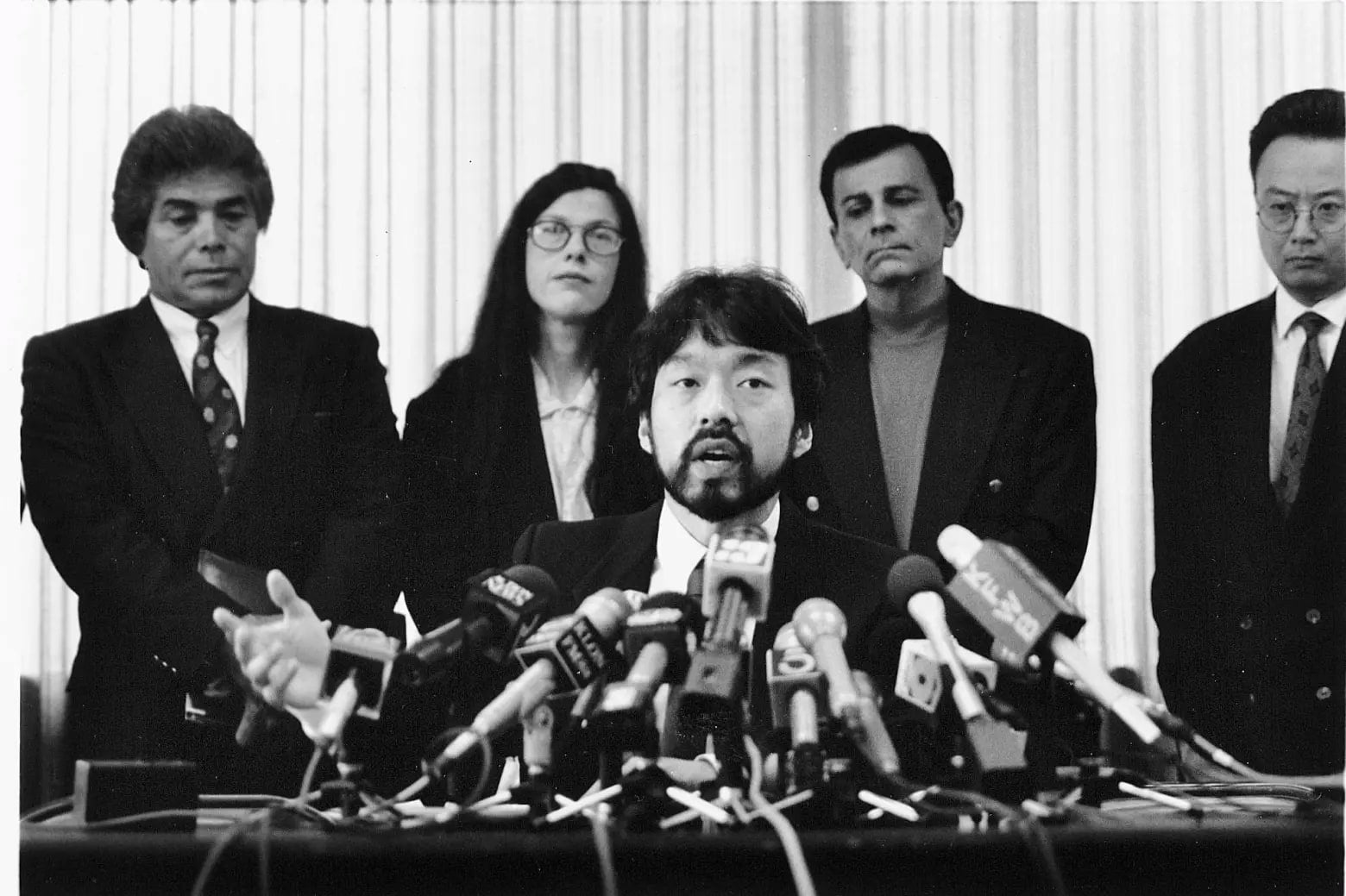 Image 27.04.02 — Guy Aoki, president of the Media Action Network for Asian Americans, addressing the offensive portrayal of Japanese characters in the film Rising Sun at a 1993 press conference.