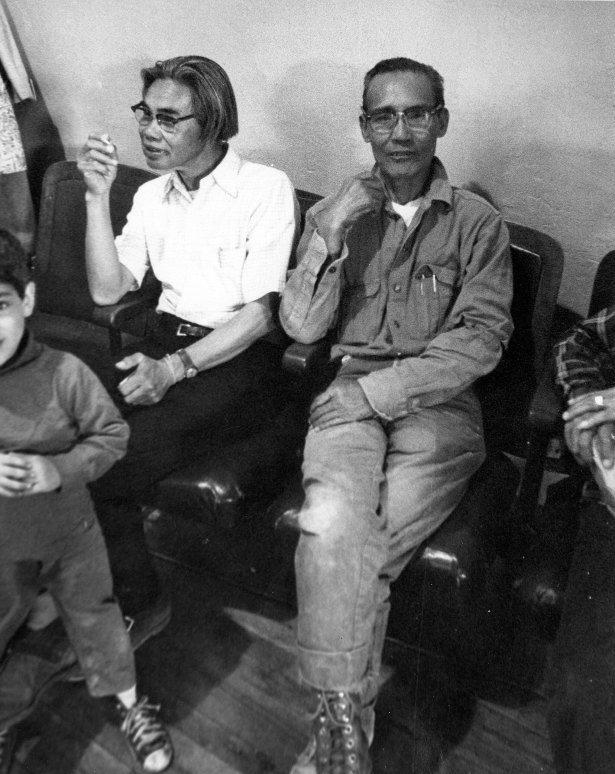 Image 46.05.02 — Philip Vera Cruz (center) and unidentified men at a boycott meeting, circa 1970s.