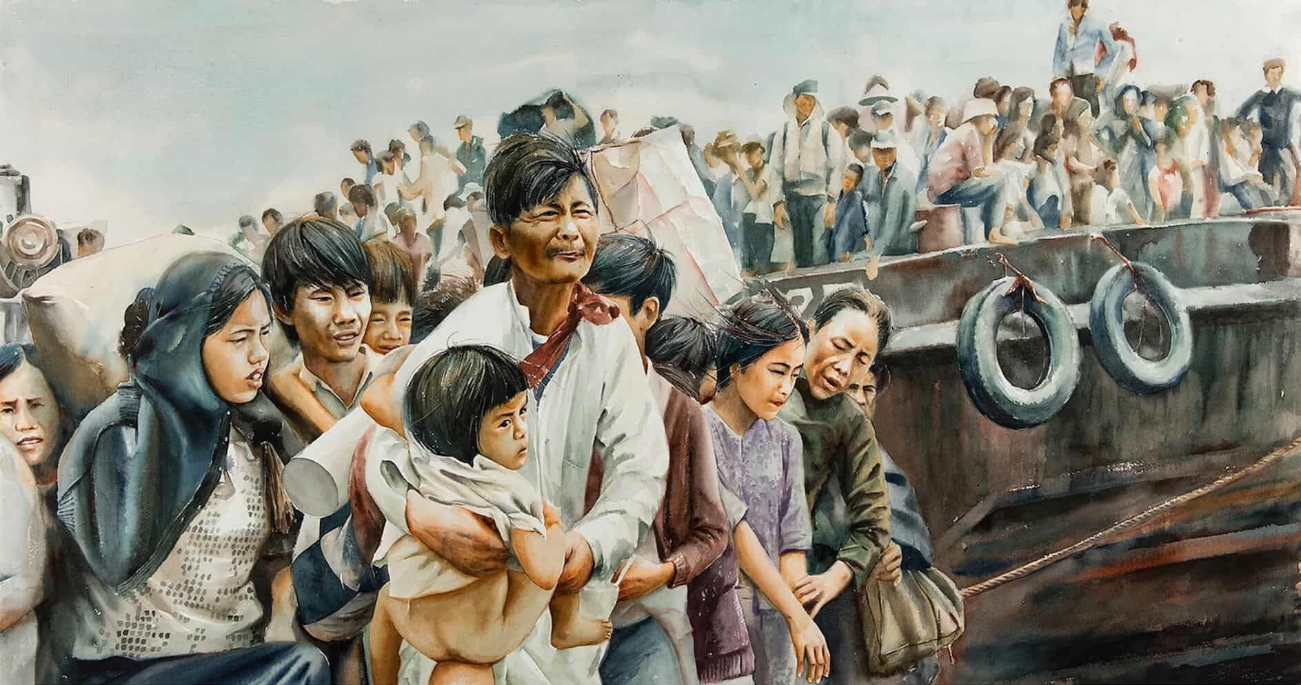 Image 50.02.01 — This 2017 watercolor by Tiffany Chang illustrates the treacherous boat journeys the Vietnamese refugees faced while migrating to the United States.